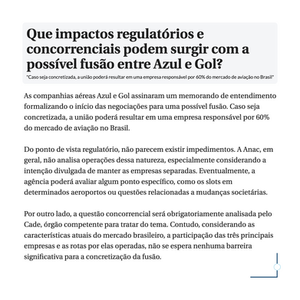 Para o especialista em Direito Regulatório, Bruno Azambuja, do ponto de vista regulatório, não há grandes obstáculos. Já a ANAC, normalmente, não analisa operações desse tipo, especialmente com a intenção de manter as empresas separadas. Já a análise da concorrência será feita pelo CADE, responsável por esse tipo de questão.